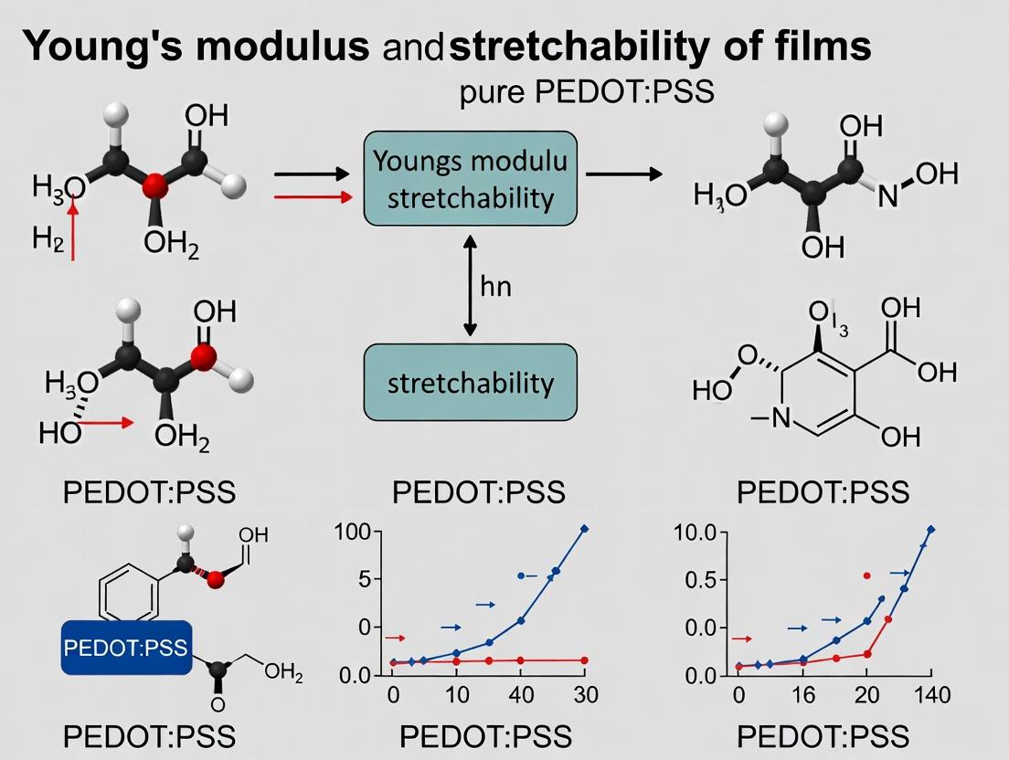 This article provides a comprehensive analysis of the mechanical properties, specifically Young's modulus and stretchability, of pure PEDOT:PSS films for biomedical applications. Targeting researchers and development professionals, it explores the fundamental principles governing film mechanics, details fabrication and measurement methodologies, addresses common optimization challenges, and validates performance against biological tissues and competing materials. The synthesis aims to guide the design of next-generation conductive, flexible bioelectronic interfaces.