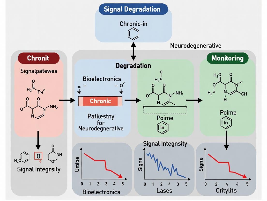 This article provides a comprehensive analysis of the challenges and solutions for maintaining high-fidelity signals in chronic neural implants used for neurodegenerative disease research and drug development. It explores the fundamental causes of signal degradation, from gliosis to material failure, and reviews cutting-edge methodological approaches in electrode design, signal processing, and wireless telemetry. The article details troubleshooting and optimization protocols for in-vivo systems, and critically compares the validation frameworks and performance metrics of current technologies. Aimed at researchers and industry professionals, this guide synthesizes engineering and neuroscience principles to enhance the reliability of long-term neural monitoring in preclinical and clinical settings.