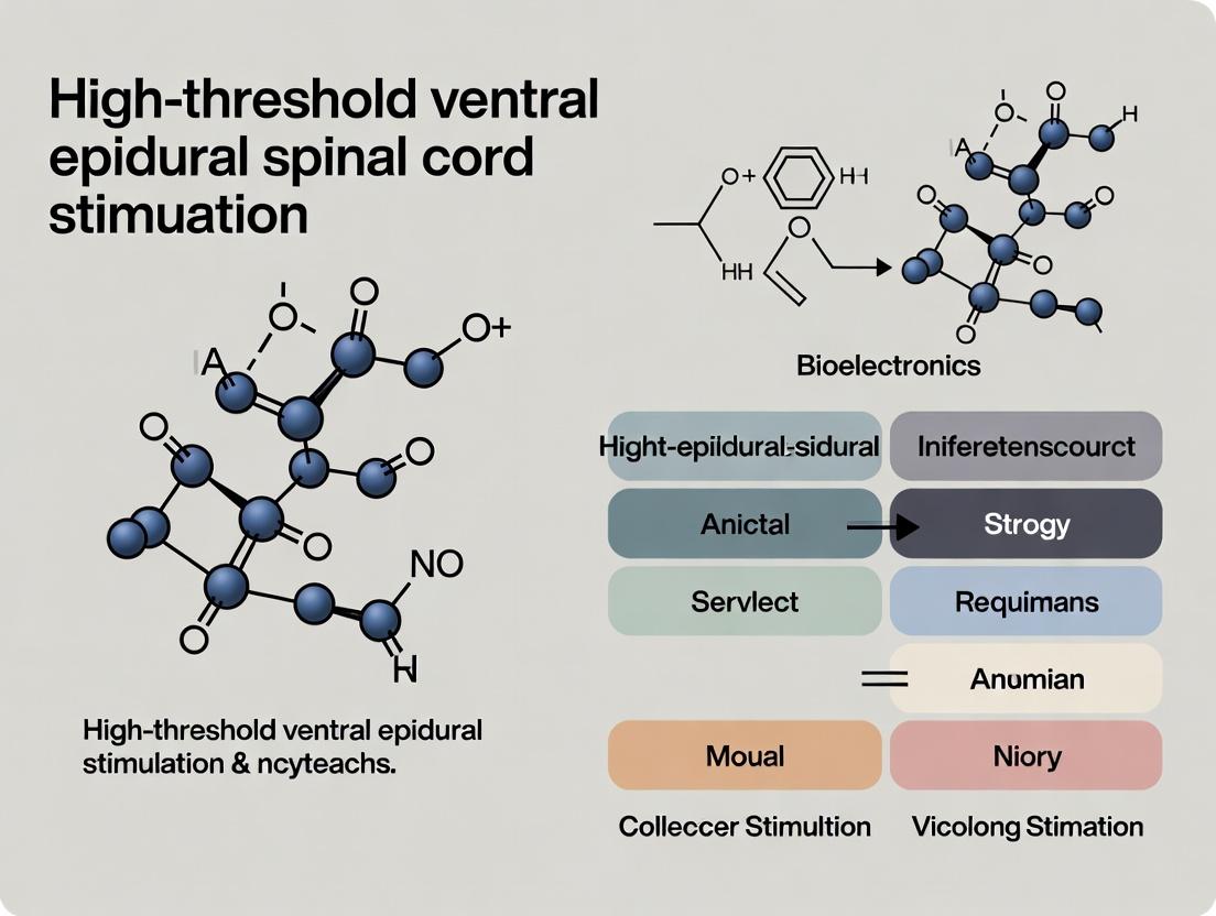 Addressing the high thresholds in ventral epidural spinal cord stimulation requires a multifaceted convergence of advanced biophysics, innovative engineering, and precise clinical methodology. The foundational understanding of CSF shunting and anatomical barriers informs the development of targeted electrode arrays and sophisticated stimulation waveforms. Methodological advancements in computational modeling and closed-loop systems are proving critical for efficient and selective activation of ventral motor pathways. Troubleshooting focuses on sustaining a stable, low-impedance interface and optimizing energy use for long-term viability. Finally, rigorous comparative validation demonstrates VESCS's unique potential for robust motor restoration, positioning it as a compelling tool not only for clinical neurorehabilitation but also as a precise platform for assessing the efficacy of novel neuroregenerative and pharmacologic therapies in preclinical and clinical drug development. Future directions must prioritize the miniaturization of systems, the discovery of novel stimulation targets within the ventral circuitry, and the establishment of standardized protocols to fully realize the translational promise of this powerful neuromodulation modality.