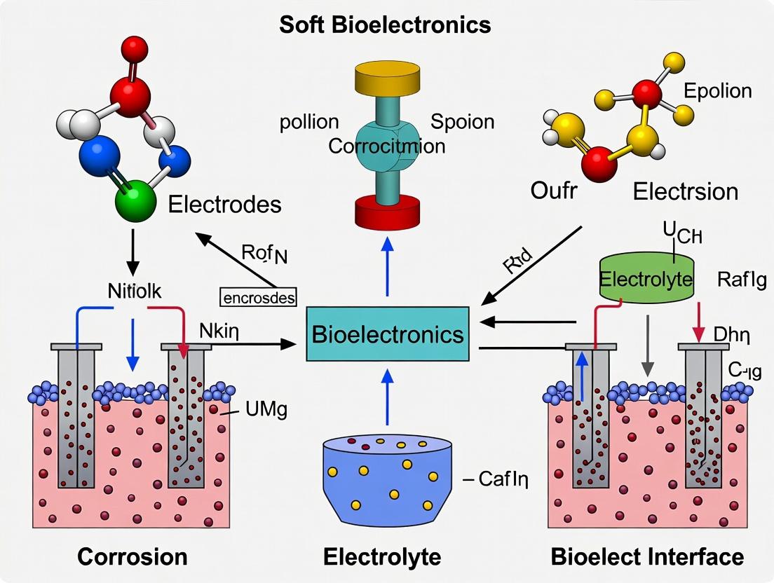 Electrochemical corrosion poses a critical challenge to the long-term stability, functionality, and biocompatibility of implantable soft bioelectronic devices. This article provides a comprehensive analysis for researchers and biomedical engineers, covering the fundamental electrochemical mechanisms driving corrosion at biotic-abiotic interfaces, innovative material and design strategies for corrosion mitigation, troubleshooting and optimization of device performance in physiological environments, and rigorous validation methods for assessing durability. We synthesize current research to offer a roadmap for developing next-generation, corrosion-resistant bioelectronics that ensure reliable chronic operation in vivo.